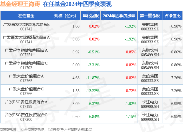广发大盘价值混合A现任基金经理为王海涛。其中在任基金经理王海涛已从业4年又320天,2021年12月7日正式接手管理广发大盘价值混合A,任职期间累计回报为-32.62%。目前还管理着8只基金产品(包括A类和C类),其中本季度表现最佳的基金为广发睿享稳健增利混合A(007251),季度净值涨幅为0.85%。