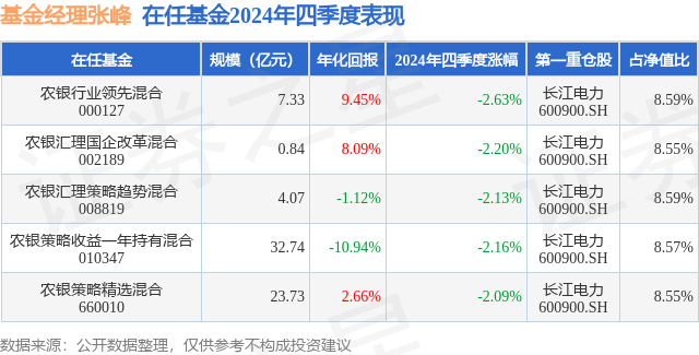 从基金规模来看,农银策略收益一年持有混合基金2024年四季度公布的基金规模为32.74亿元,较上一期规模35.3亿元变化了-2.56亿元,环比变化了-7.25%。该基金最新一期资产配置为:股票占净值比76.66%,债券占净值比13.22%,现金占净值比1.72%。从基金持仓来看,该基金当季前十大股票仓位达40.34%,第一大重仓股为长江电力(600900),持仓占比为8.57%。