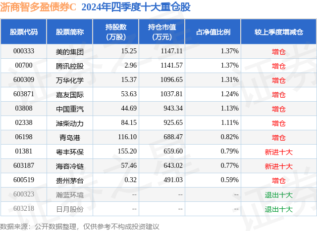 从基金规模来看,浙商智多盈债券C基金2024年四季度公布的基金规模为0.83亿元,较上一期规模4304.23万元变化了3961.5万元,环比变化了92.04%。该基金最新一期资产配置为:股票占净值比13.39%,债券占净值比84.79%,现金占净值比1.17%。从基金持仓来看,该基金当季前十大股票仓位达10.5%,第一大重仓股为美的集团(000333),持仓占比为1.37%。