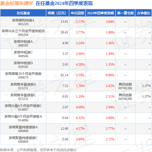 浙商智多盈债券C现任基金经理为朱靖宇 刘新正 黄玥,本季度增聘基金经理黄玥。其中在任基金经理朱靖宇已从业3年又293天,2022年10月20日正式接手管理浙商智多盈债券C,任职期间累计回报为7.05%。目前还管理着12只基金产品(包括A类和C类),其中本季度表现最佳的基金为浙商惠利纯债A(003220),季度净值涨幅为3.04%。