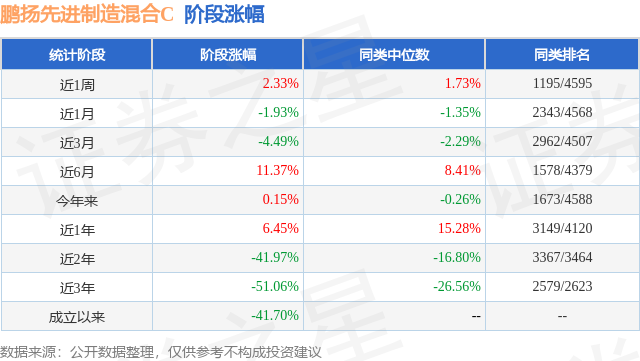 从业绩表现来看,鹏扬先进制造混合C基金过去一年净值涨幅为6.45%,在同类基金中排名3149/4120,同类基金过去一年净值涨幅中位数为15.28%。而基金过去一年的最大回撤为-21.87%,成立以来的最大回撤为-69.08%。