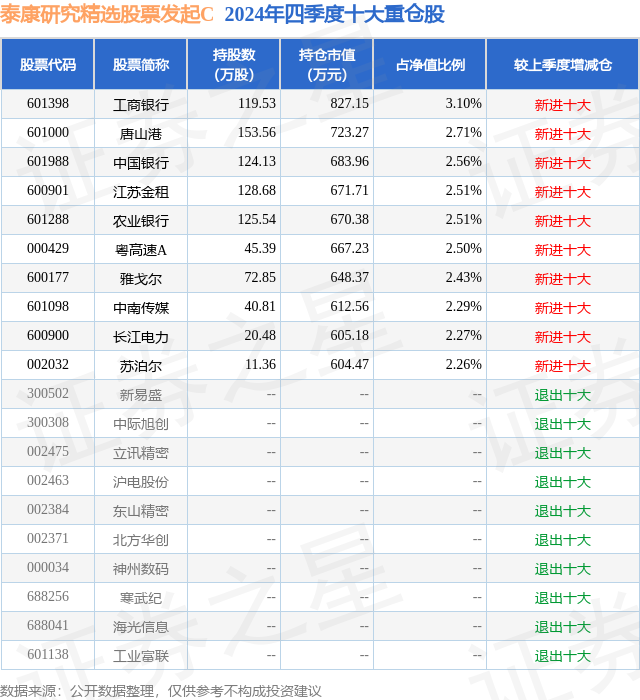 证券之星消息,日前泰康研究精选股票发起C基金公布四季报,2024年四季度最新规模2.5亿元,季度净值涨幅为13.02%。