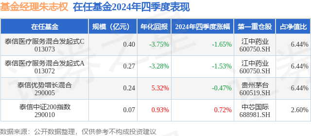 证券之星消息,日前泰信医疗服务混合发起式A基金公布四季报,2024年四季度最新规模0.27亿元,季度净值涨幅为-1.53%。