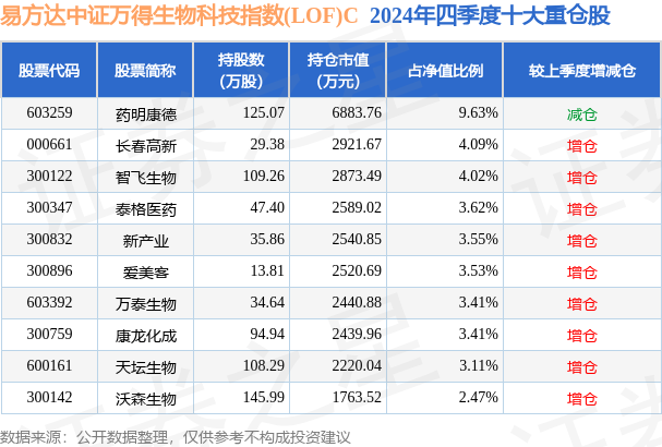 证券之星消息,日前易方达中证万得生物科技指数(LOF)C基金公布四季报,2024年四季度最新规模0.93亿元,季度净值涨幅为-9.59%。