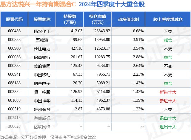 从基金规模来看,易方达悦兴一年持有期混合C基金2024年四季度公布的基金规模为8.73亿元,较上一期规模11.0亿元变化了-2.27亿元,环比变化了-20.6%。该基金最新一期资产配置为:股票占净值比28.81%,债券占净值比98.39%,现金占净值比1.4%。从基金持仓来看,该基金当季前十大股票仓位达27.36%,第一大重仓股为扬农化工(600486),持仓占比为6.68%。