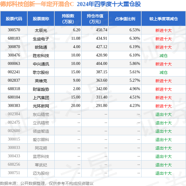从基金规模来看,德邦科技创新一年定开混合C基金2024年四季度公布的基金规模为0.09亿元,较上一期规模1137.87万元变化了-200.72万元,环比变化了-17.64%。该基金最新一期资产配置为:股票占净值比84.31%,无债券类资产,现金占净值比16.04%。从基金持仓来看,该基金当季前十大股票仓位达55.56%,第一大重仓股为太辰光(300570),持仓占比为6.53%。