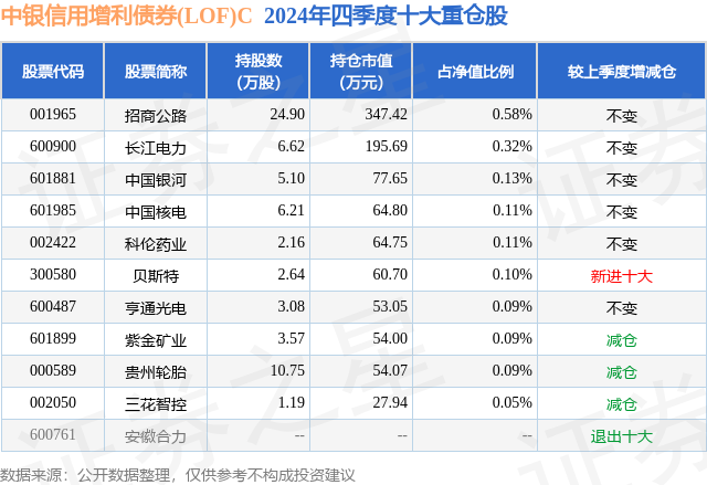 从基金规模来看,中银信用增利债券(LOF)C基金2024年四季度公布的基金规模为0.51亿元,较上一期规模4850.99万元变化了209.6万元,环比变化了4.32%。该基金最新一期资产配置为:股票占净值比1.75%,债券占净值比135.07%,现金占净值比4.3%。从基金持仓来看,该基金当季前十大股票仓位达1.67%,第一大重仓股为招商公路(001965),持仓占比为0.58%。