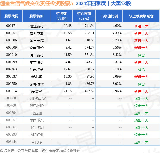 从基金规模来看,创金合信气候变化责任投资股票A基金2024年四季度公布的基金规模为0.64亿元,较上一期规模8105.77万元变化了-1712.15万元,环比变化了-21.12%。该基金最新一期资产配置为:股票占净值比86.5%,无债券类资产,现金占净值比13.35%。从基金持仓来看,该基金当季前十大股票仓位达35.3%,第一大重仓股为楚江新材(002171),持仓占比为4.6%。