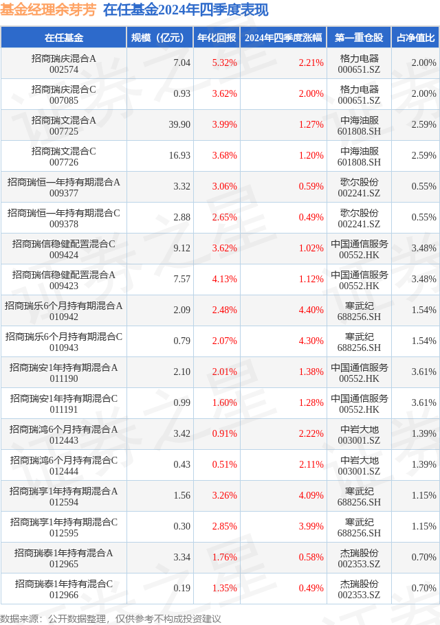 招商瑞鸿6个月持有混合C现任基金经理为余芽芳 阳宜洋。其中在任基金经理余芽芳已从业7年又287天,2021年12月21日正式接手管理招商瑞鸿6个月持有混合C,任职期间累计回报为1.57%。目前还管理着18只基金产品(包括A类和C类),其中本季度表现最佳的基金为招商瑞乐6个月持有期混合A(010942),季度净值涨幅为4.4%。