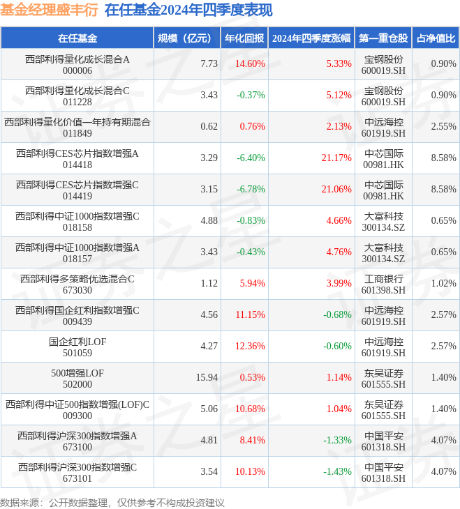 证券之星消息,日前西部利得CES芯片指数增强A基金公布四季报,2024年四季度最新规模3.29亿元,季度净值涨幅为21.17%。