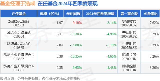 从基金规模来看,泓德卓远混合A基金2024年四季度公布的基金规模为16.11亿元,较上一期规模17.93亿元变化了-1.82亿元,环比变化了-10.14%。该基金最新一期资产配置为:股票占净值比89.88%,无债券类资产,现金占净值比9.95%。从基金持仓来看,该基金当季前十大股票仓位达51.58%,第一大重仓股为宁德时代(300750),持仓占比为8.29%。