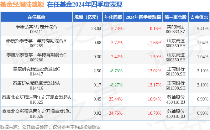 泰康北交所精选两年定开混合发起C现任基金经理为陆建巍。其中在任基金经理陆建巍已从业3年又42天,2023年4月7日正式接手管理泰康北交所精选两年定开混合发起C,任职期间累计回报为70.25%。目前还管理着7只基金产品(包括A类和C类),其中本季度表现最佳的基金为泰康北交所精选两年定开混合发起A(016325),季度净值涨幅为16.94%。