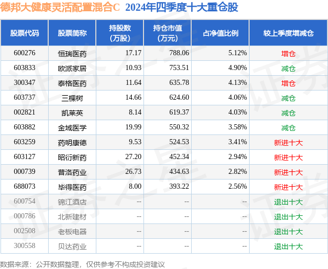证券之星消息,日前德邦大健康灵活配置混合C基金公布四季报,2024年四季度最新规模0.0亿元,季度净值涨幅为-7.72%。