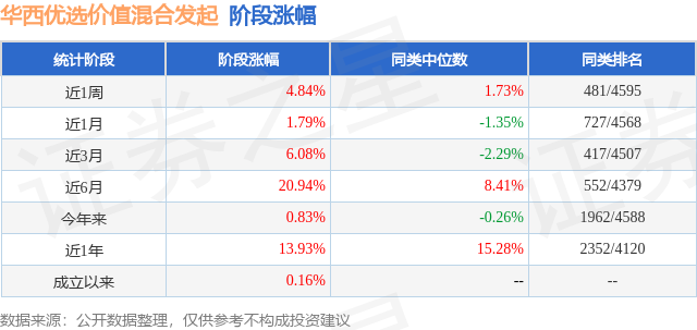 从业绩表现来看,华西优选价值混合发起基金过去一年净值涨幅为13.93%,在同类基金中排名2352/4120,同类基金过去一年净值涨幅中位数为15.28%。而基金过去一年的最大回撤为-20.51%,成立以来的最大回撤为-25.13%。