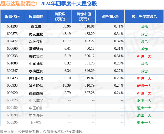 从基金规模来看,易方达瑞财混合I基金2024年四季度公布的基金规模为12.66亿元,较上一期规模12.23亿元变化了4291.1万元,环比变化了3.51%。该基金最新一期资产配置为:股票占净值比7.39%,债券占净值比112.7%,现金占净值比0.31%。从基金持仓来看,该基金当季前十大股票仓位达2.97%,第一大重仓股为青岛港(601298),持仓占比为0.41%。