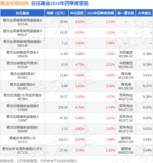 证券之星消息,日前易方达瑞财混合I基金公布四季报,2024年四季度最新规模12.66亿元,季度净值涨幅为3.63%。