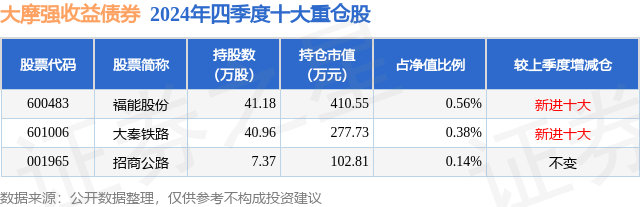 从基金规模来看,大摩强收益债券基金2024年四季度公布的基金规模为7.38亿元,较上一期规模8.09亿元变化了-7091.8万元,环比变化了-8.76%。该基金最新一期资产配置为:股票占净值比1.07%,债券占净值比131.92%,现金占净值比1.14%。从基金持仓来看,该基金当季前十大股票仓位达1.08%,第一大重仓股为福能股份(600483),持仓占比为0.56%。
