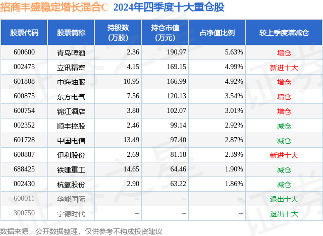 从基金规模来看,招商丰盛稳定增长混合C基金2024年四季度公布的基金规模为0.1亿元,较上一期规模1013.76万元变化了-33.57万元,环比变化了-3.31%。该基金最新一期资产配置为:股票占净值比57.56%,债券占净值比28.74%,现金占净值比3.28%。从基金持仓来看,该基金当季前十大股票仓位达34.03%,第一大重仓股为青岛啤酒(600600),持仓占比为5.63%。