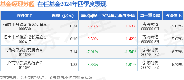 招商丰盛稳定增长混合C现任基金经理为苏超。其中在任基金经理苏超已从业1年又60天,2024年3月26日正式接手管理招商丰盛稳定增长混合C,任职期间累计回报为3.72%。目前还管理着4只基金产品(包括A类和C类),其中本季度表现最佳的基金为招商丰盛稳定增长混合A(000530),季度净值涨幅为1.63%。