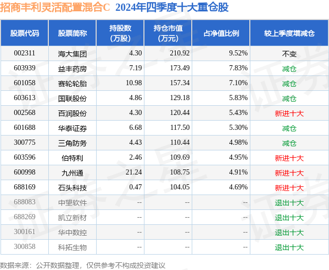 从基金规模来看,招商丰利灵活配置混合C基金2024年四季度公布的基金规模为0.01亿元,较上一期规模129.45万元变化了-14.07万元,环比变化了-10.87%。该基金最新一期资产配置为:股票占净值比93.43%,债券占净值比5.49%,现金占净值比1.25%。从基金持仓来看,该基金当季前十大股票仓位达60.54%,第一大重仓股为海大集团(002311),持仓占比为9.52%。