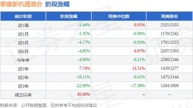 从业绩表现来看,泰康新机遇混合基金过去一年净值涨幅为7.74%,在同类基金中排名1439/2277,同类基金过去一年净值涨幅中位数为11.51%。而基金过去一年的最大回撤为-12.71%,成立以来的最大回撤为-44.63%。