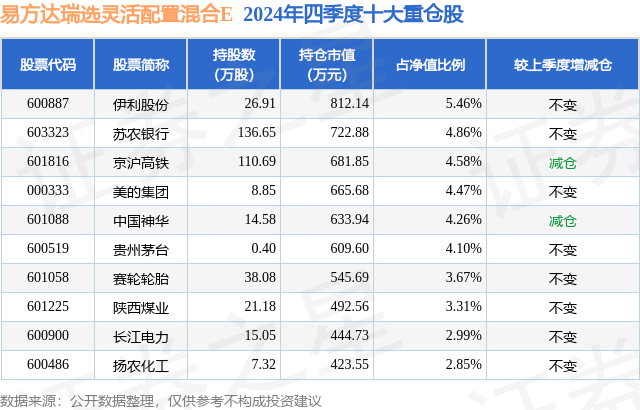 从基金规模来看,易方达瑞选灵活配置混合E基金2024年四季度公布的基金规模为1.05亿元,较上一期规模9807.03万元变化了655.76万元,环比变化了6.69%。该基金最新一期资产配置为:股票占净值比46.58%,债券占净值比82.78%,现金占净值比1.13%。从基金持仓来看,该基金当季前十大股票仓位达40.55%,第一大重仓股为伊利股份(600887),持仓占比为5.46%。