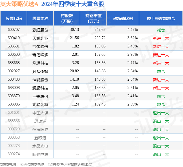 从基金规模来看,英大策略优选A基金2024年四季度公布的基金规模为0.54亿元,较上一期规模5592.8万元变化了-215.49万元,环比变化了-3.85%。该基金最新一期资产配置为:股票占净值比88.61%,无债券类资产,现金占净值比12.12%。从基金持仓来看,该基金当季前十大股票仓位达29.71%,第一大重仓股为彩虹股份(600707),持仓占比为4.47%。