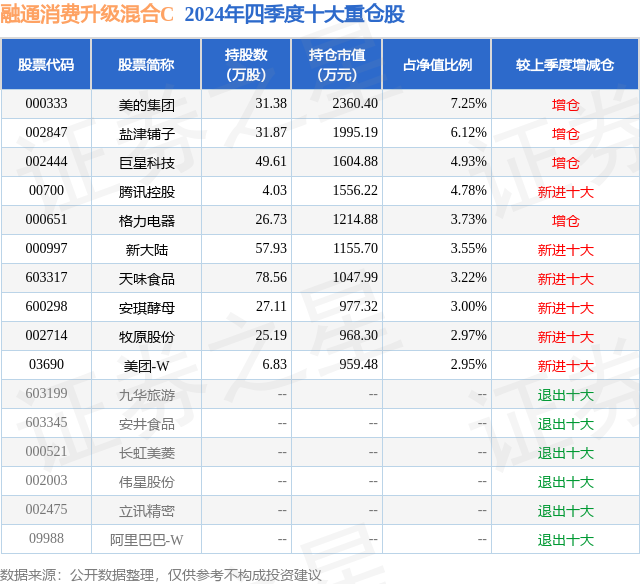 从基金规模来看,融通消费升级混合C基金2024年四季度公布的基金规模为0.59亿元,较上一期规模2401.76万元变化了3546.94万元,环比变化了147.68%。该基金最新一期资产配置为:股票占净值比83.72%,债券占净值比0.04%,现金占净值比16.19%。从基金持仓来看,该基金当季前十大股票仓位达42.5%,第一大重仓股为美的集团(000333),持仓占比为7.25%。