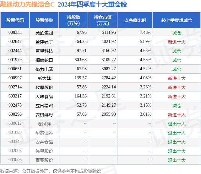 从基金规模来看,融通动力先锋混合C基金2024年四季度公布的基金规模为0.0亿元,较上一期规模10.22万元变化了-3.59万元,环比变化了-35.14%。该基金最新一期资产配置为:股票占净值比83.47%,债券占净值比0.09%,现金占净值比17.65%。从基金持仓来看,该基金当季前十大股票仓位达43.78%,第一大重仓股为美的集团(000333),持仓占比为7.48%。
