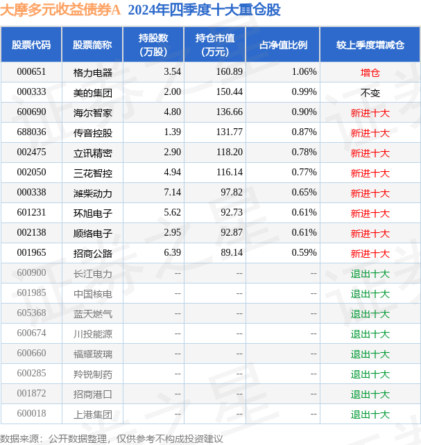 从基金规模来看,大摩多元收益债券A基金2024年四季度公布的基金规模为1.08亿元,较上一期规模1.35亿元变化了-2649.74万元,环比变化了-19.68%。该基金最新一期资产配置为:股票占净值比16.15%,债券占净值比121.1%,现金占净值比2.44%。从基金持仓来看,该基金当季前十大股票仓位达7.83%,第一大重仓股为格力电器(000651),持仓占比为1.06%。