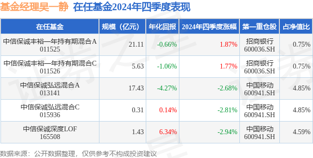 从基金规模来看,中信保诚深度LOF基金2024年四季度公布的基金规模为1.43亿元,较上一期规模4.81亿元变化了-3.39亿元,环比变化了-70.33%。该基金最新一期资产配置为:股票占净值比80.33%,无债券类资产,现金占净值比19.07%。从基金持仓来看,该基金当季前十大股票仓位达34.49%,第一大重仓股为中国移动(600941),持仓占比为4.59%。