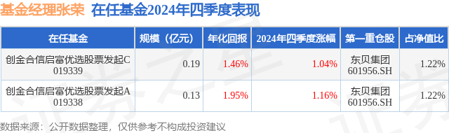 从基金规模来看,创金合信启富优选股票发起A基金2024年四季度公布的基金规模为0.13亿元,较上一期规模1551.01万元变化了-201.92万元,环比变化了-13.02%。该基金最新一期资产配置为:股票占净值比81.46%,债券占净值比6.57%,现金占净值比1.11%。从基金持仓来看,该基金当季前十大股票仓位达11.64%,第一大重仓股为东贝集团(601956),持仓占比为1.22%。