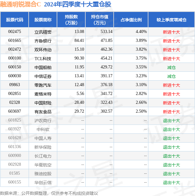 证券之星消息,日前融通明锐混合C基金公布四季报,2024年四季度最新规模0.19亿元,季度净值涨幅为-2.7%。