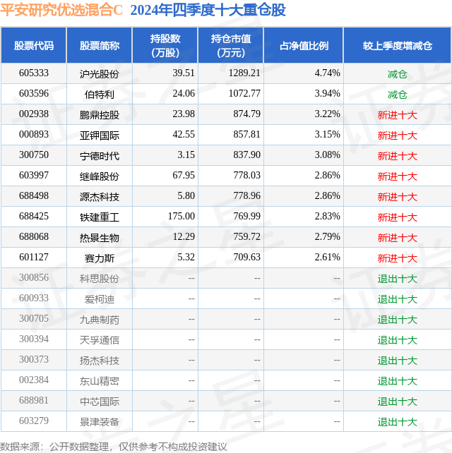 证券之星消息,日前平安研究优选混合C基金公布四季报,2024年四季度最新规模0.69亿元,季度净值涨幅为-1.32%。