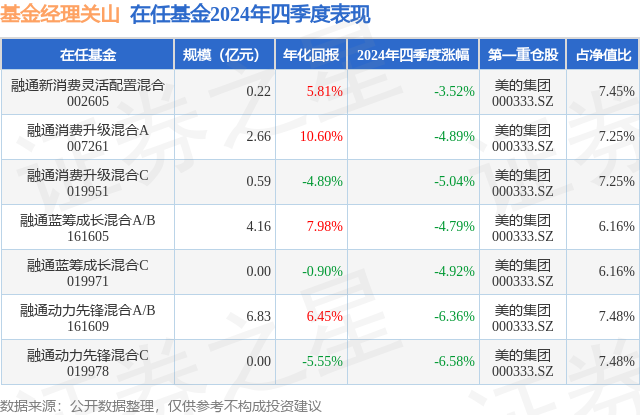 从基金规模来看,融通新消费灵活配置混合基金2024年四季度公布的基金规模为0.22亿元,较上一期规模2328.22万元变化了-107.64万元,环比变化了-4.62%。该基金最新一期资产配置为:股票占净值比81.52%,债券占净值比0.1%,现金占净值比19.59%。从基金持仓来看,该基金当季前十大股票仓位达42.33%,第一大重仓股为美的集团(000333),持仓占比为7.45%。