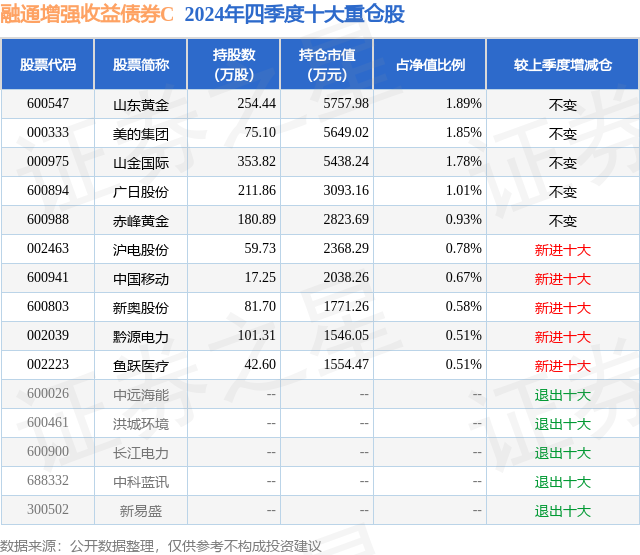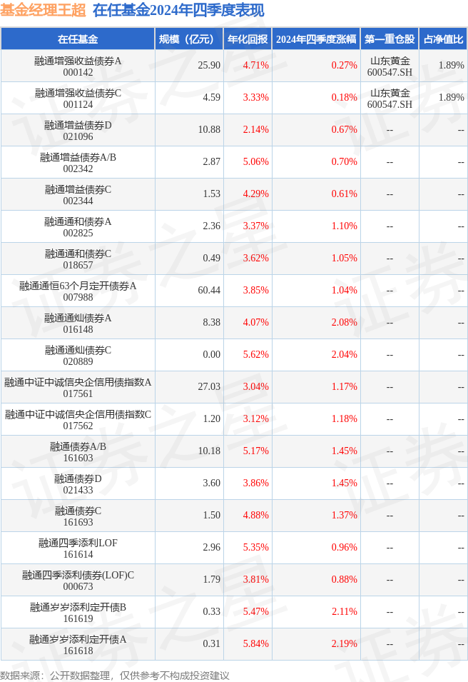从基金规模来看,融通增强收益债券C基金2024年四季度公布的基金规模为4.59亿元,较上一期规模3.15亿元变化了1.45亿元,环比变化了45.93%。该基金最新一期资产配置为:股票占净值比16.29%,债券占净值比95.74%,现金占净值比4.44%。从基金持仓来看,该基金当季前十大股票仓位达10.51%,第一大重仓股为山东黄金(600547),持仓占比为1.89%。