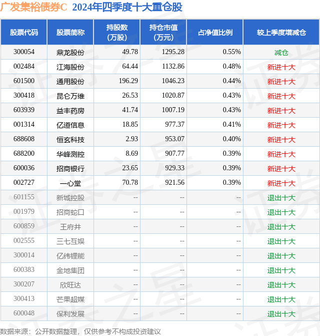 从基金规模来看,广发集裕债券C基金2024年四季度公布的基金规模为1.91亿元,较上一期规模1.77亿元变化了1350.46万元,环比变化了7.62%。该基金最新一期资产配置为:股票占净值比12.93%,债券占净值比103.79%,现金占净值比1.23%。从基金持仓来看,该基金当季前十大股票仓位达4.31%,第一大重仓股为鼎龙股份(300054),持仓占比为0.55%。