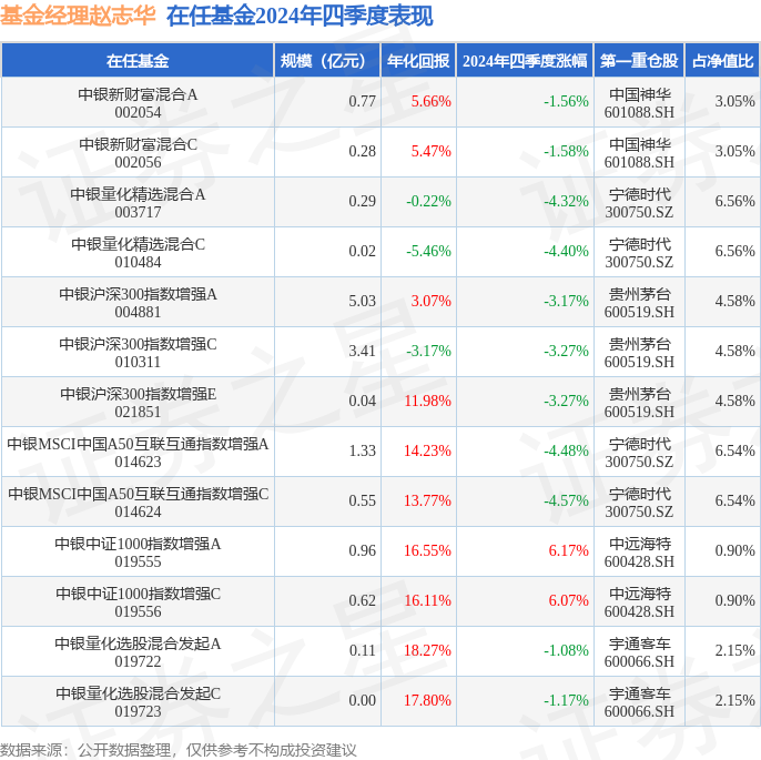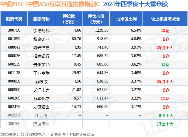 证券之星消息,日前中银MSCI中国A50互联互通指数增强C基金公布四季报,2024年四季度最新规模0.55亿元,季度净值涨幅为-4.57%。