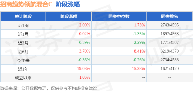 从业绩表现来看,招商趋势领航混合C基金过去一年净值涨幅为19.08%,在同类基金中排名1621/4120,同类基金过去一年净值涨幅中位数为15.28%。而基金过去一年的最大回撤为-7.58%,成立以来的最大回撤为-19.18%。