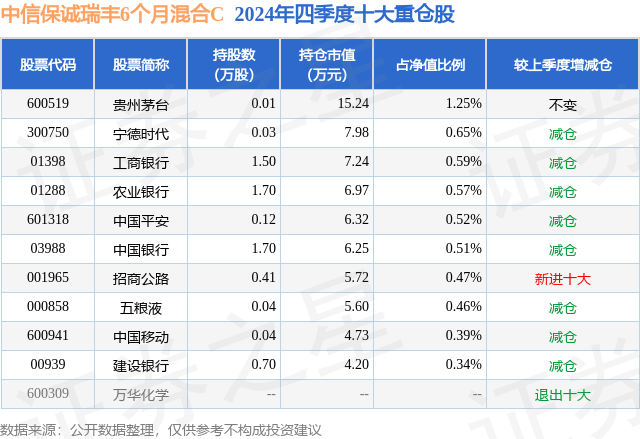 从基金规模来看,中信保诚瑞丰6个月混合C基金2024年四季度公布的基金规模为0.11亿元,较上一期规模1693.08万元变化了-596.24万元,环比变化了-35.22%。该基金最新一期资产配置为:股票占净值比21.2%,债券占净值比75.28%,现金占净值比4.46%。从基金持仓来看,该基金当季前十大股票仓位达5.75%,第一大重仓股为贵州茅台(600519),持仓占比为1.25%。
