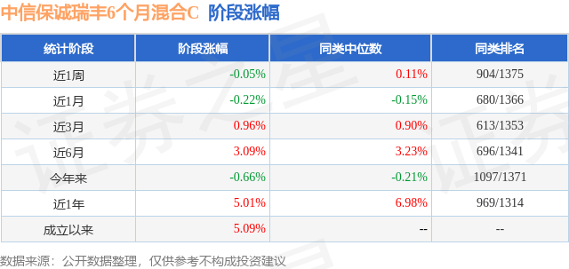 从业绩表现来看,中信保诚瑞丰6个月混合C基金过去一年净值涨幅为5.01%,在同类基金中排名969/1314,同类基金过去一年净值涨幅中位数为6.98%。而基金过去一年的最大回撤为-2.48%,成立以来的最大回撤为-2.48%。