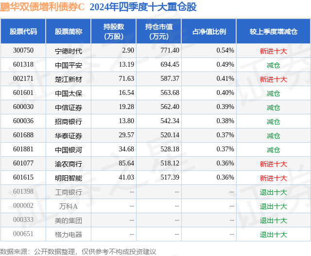 从基金规模来看,鹏华双债增利债券C基金2024年四季度公布的基金规模为0.01亿元,较上一期规模3.58万元变化了110.72万元,环比变化了3089.13%。该基金最新一期资产配置为:股票占净值比17.45%,债券占净值比98.32%,现金占净值比2.85%。从基金持仓来看,该基金当季前十大股票仓位达4.07%,第一大重仓股为宁德时代(300750),持仓占比为0.54%。