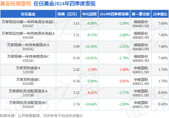 从基金规模来看,万家颐和灵活配置混合A基金2024年四季度公布的基金规模为3.52亿元,较上一期规模4.35亿元变化了-8329.35万元,环比变化了-19.13%。该基金最新一期资产配置为:股票占净值比93.89%,无债券类资产,现金占净值比8.55%。从基金持仓来看,该基金当季前十大股票仓位达68.42%,第一大重仓股为华能国际(600011),持仓占比为8.6%。