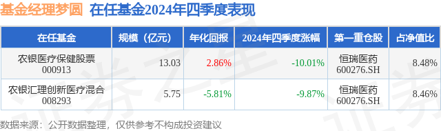 证券之星消息,日前农银医疗保健股票基金公布四季报,2024年四季度最新规模13.03亿元,季度净值涨幅为-10.01%。