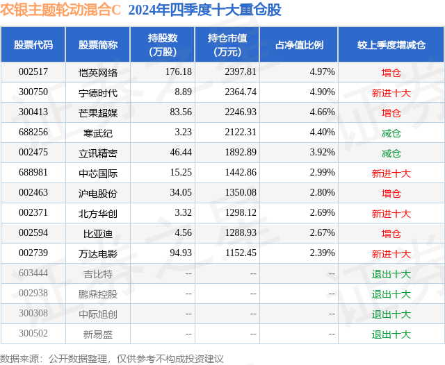 从基金规模来看,农银主题轮动混合C基金2024年四季度公布的基金规模为0.01亿元,较上一期规模70.43万元变化了19.73万元,环比变化了28.02%。该基金最新一期资产配置为:股票占净值比85.85%,债券占净值比2.85%,现金占净值比7.01%。从基金持仓来看,该基金当季前十大股票仓位达36.39%,第一大重仓股为恺英网络(002517),持仓占比为4.97%。