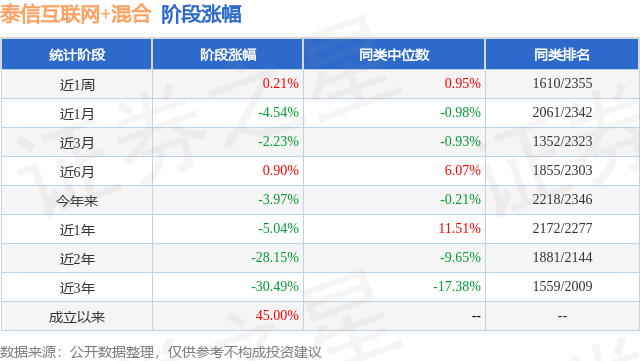 从业绩表现来看,泰信互联网+混合基金过去一年净值涨幅为-5.04%,在同类基金中排名2172/2277,同类基金过去一年净值涨幅中位数为11.51%。而基金过去一年的最大回撤为-35.25%,成立以来的最大回撤为-47.74%。