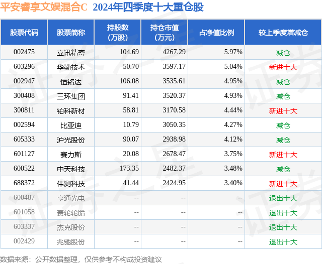 从基金规模来看,平安睿享文娱混合C基金2024年四季度公布的基金规模为2.3亿元,较上一期规模2.2亿元变化了1017.79万元,环比变化了4.62%。该基金最新一期资产配置为:股票占净值比87.14%,无债券类资产,现金占净值比10.92%。从基金持仓来看,该基金当季前十大股票仓位达44.35%,第一大重仓股为立讯精密(002475),持仓占比为5.97%。