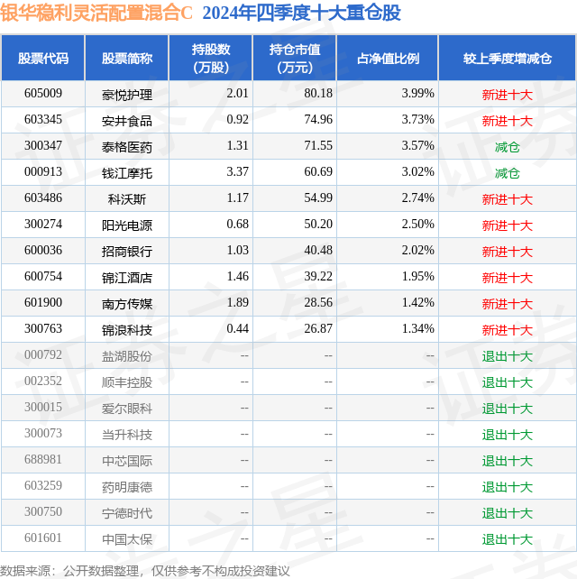 从基金规模来看,银华稳利灵活配置混合C基金2024年四季度公布的基金规模为0.08亿元,较上一期规模877.09万元变化了-74.78万元,环比变化了-8.53%。该基金最新一期资产配置为:股票占净值比30.1%,债券占净值比7.08%,现金占净值比62.26%。从基金持仓来看,该基金当季前十大股票仓位达26.28%,第一大重仓股为豪悦护理(605009),持仓占比为3.99%。