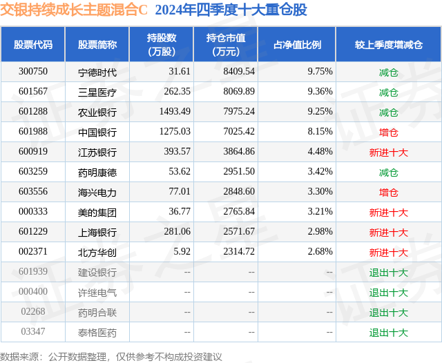 从基金规模来看,交银持续成长主题混合C基金2024年四季度公布的基金规模为0.06亿元,较上一期规模788.35万元变化了-164.98万元,环比变化了-20.93%。该基金最新一期资产配置为:股票占净值比83.82%,债券占净值比5.87%,现金占净值比17.6%。从基金持仓来看,该基金当季前十大股票仓位达56.58%,第一大重仓股为宁德时代(300750),持仓占比为9.75%。