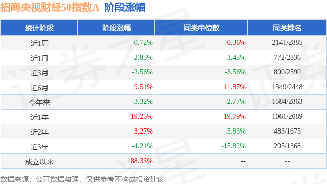 从业绩表现来看,招商央视财经50指数A基金过去一年净值涨幅为19.25%,在同类基金中排名1061/2089,同类基金过去一年净值涨幅中位数为19.79%。而基金过去一年的最大回撤为-12.02%,成立以来的最大回撤为-41.23%。